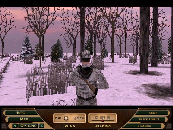Polowanie na jelenie w zimowej scenerii. Masz do dyspozycji strzelbę z wizjerem i możesz ustrzelić jelenia lub królika.